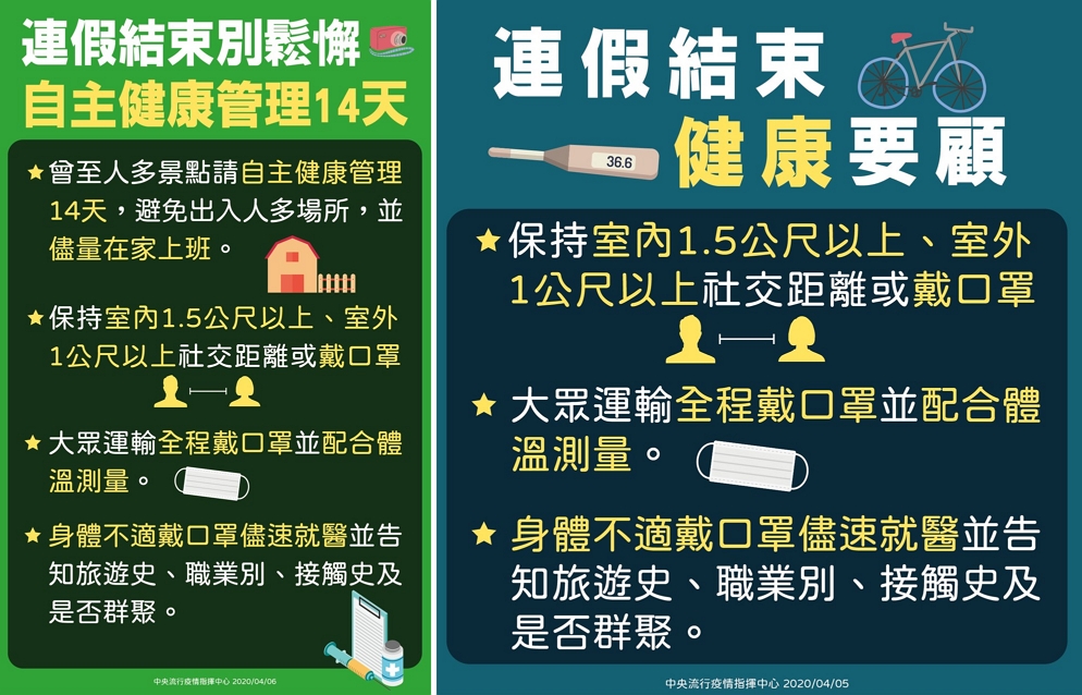 中央流行疫情指揮中心今(6)日表示,清明連假民眾南來北往互動頻繁,且部分觀光景點人潮密集,為確保國內社區防疫安全,民眾若在連假期間曾至人潮擁擠的地方活動,請自主健康管理14天,避免出入公共場所,外出時務必配戴口罩,儘可能在家上班。如有身體不適請撥打免付費防疫專線1922,就醫時務必告知旅遊史。
