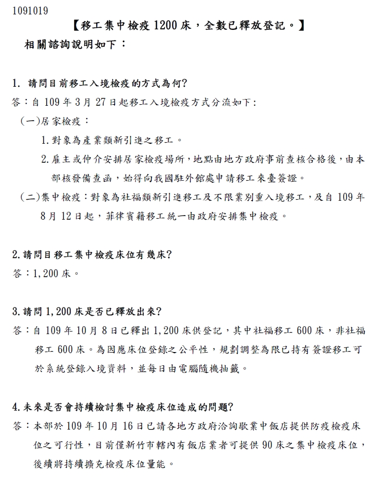 「嚴重特殊傳染性肺炎」(COVID-19)持續,為落實防疫及檢疫措施,社福移工、返鄉休假移工及菲律賓移工入境後,依指揮中心要求都應到集中檢疫所檢疫。勞動部表示,經衛福部協助,目前已提供勞動部1,200床集中檢疫床位。勞動部自10月8日起,依雇主安排移工入境期程,開放1,200床供登記使用,另外勞動部將會滾動檢討床位分配及運用情形。