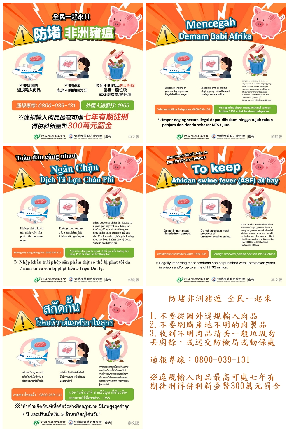 勞動部訂定「雇主、仲介機構及移工防範非洲豬瘟宣導及訪視計畫」