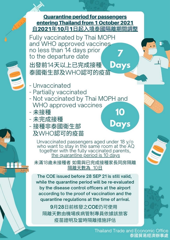 110.09.29-2021年10月1日起入境泰國隔離期間調整 閱讀:366